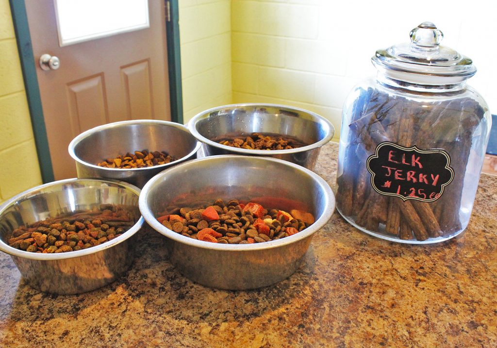 Our dog kitchen is stocked with all the equipment needed to heat, cool, freeze and store any diet. In order to avoid stomach upset, please provide us with your dog’s regular diet in a sealed container to ensure freshness. Labeled zip lock bags work wonderfully.